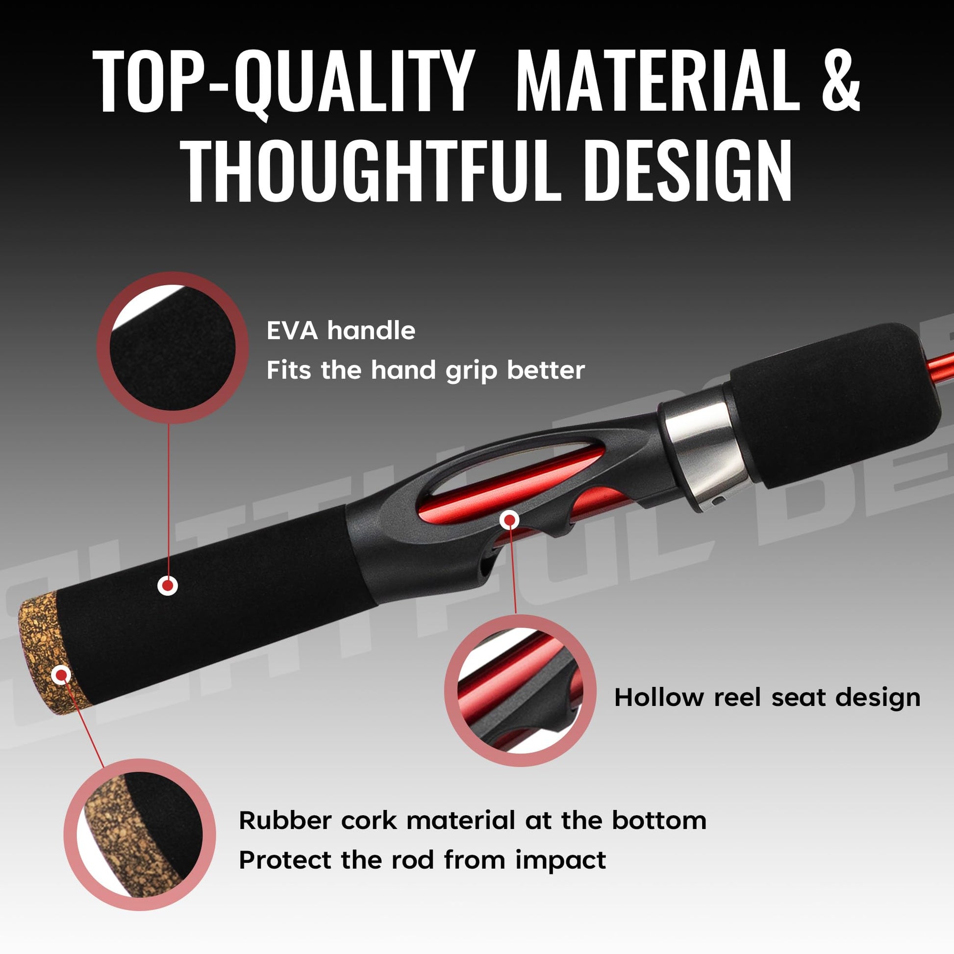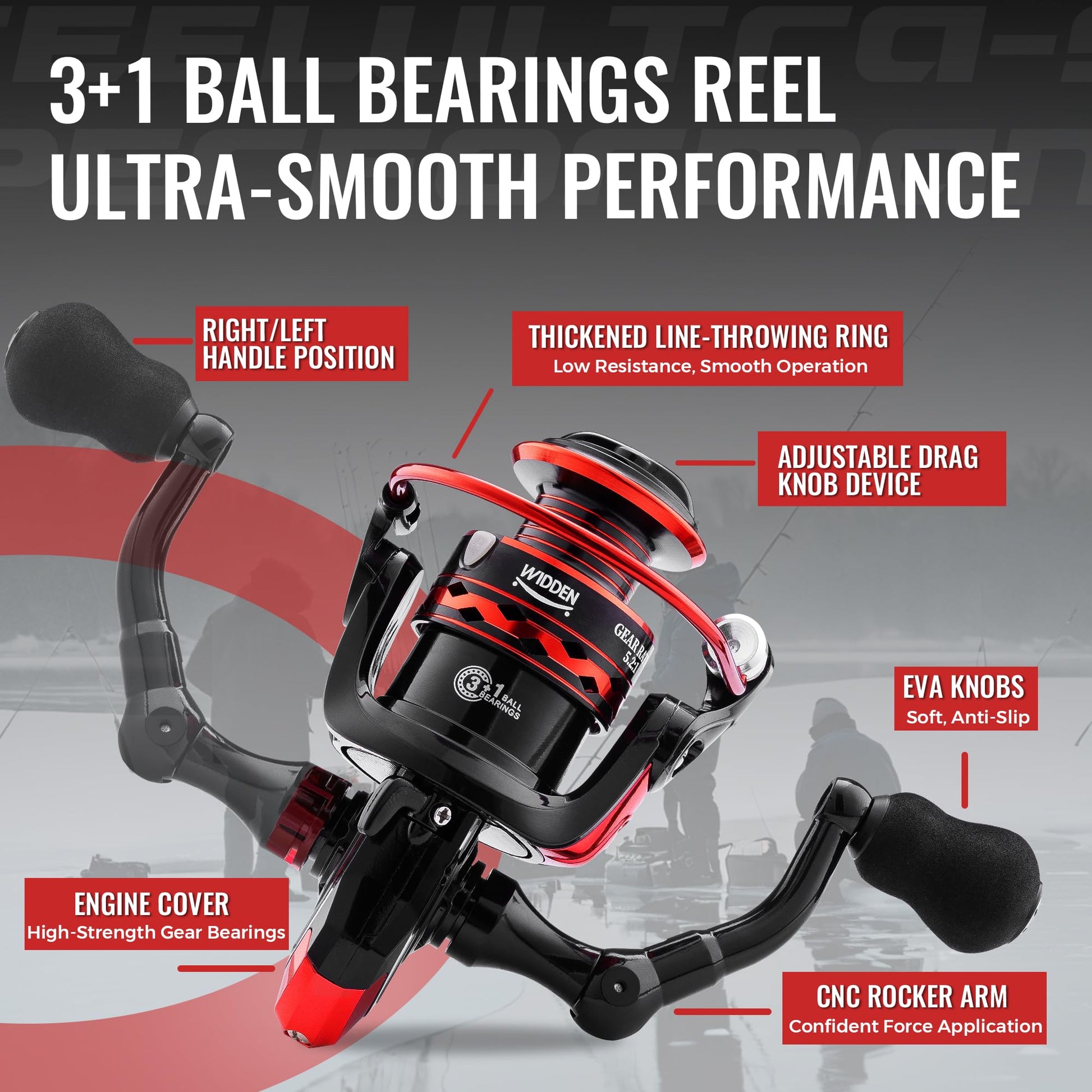 • [The Rod] This ice fishing rod and reel combo adopts a hollow reel seat design, and the silver and black color combination makes it more beautiful. The EVA handle fits the hand grip better, and the rubber cork material at the bottom can protect the rod from impact. WIDDEN uses top-quality materials to increase your fishing experience and comfort